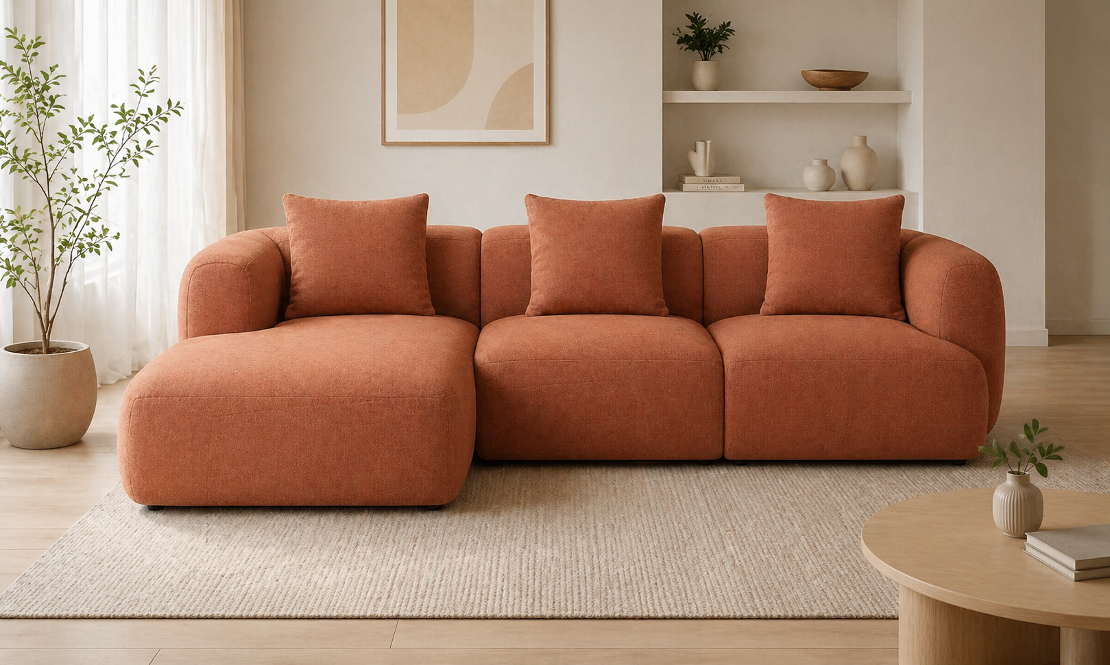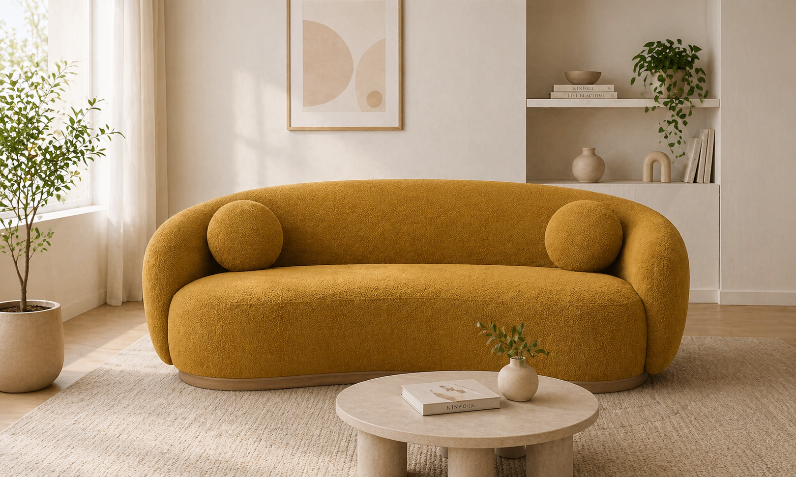 Sofá de 3 plazas con dise?o curvo y moderno que destaca por su estética orgánica y elegante. Tapizado en tela bouclé de color mostaza, aporta calidez y personalidad a cualquier espacio. Su estructura resistente y su base de madera garantizan estabilidad y durabilidad, mientras que su forma envolvente y los cojines redondos decorativos ofrecen un alto nivel de confort. Ideal para salones contemporáneos que buscan un equilibrio entre dise?o y funcionalidad.